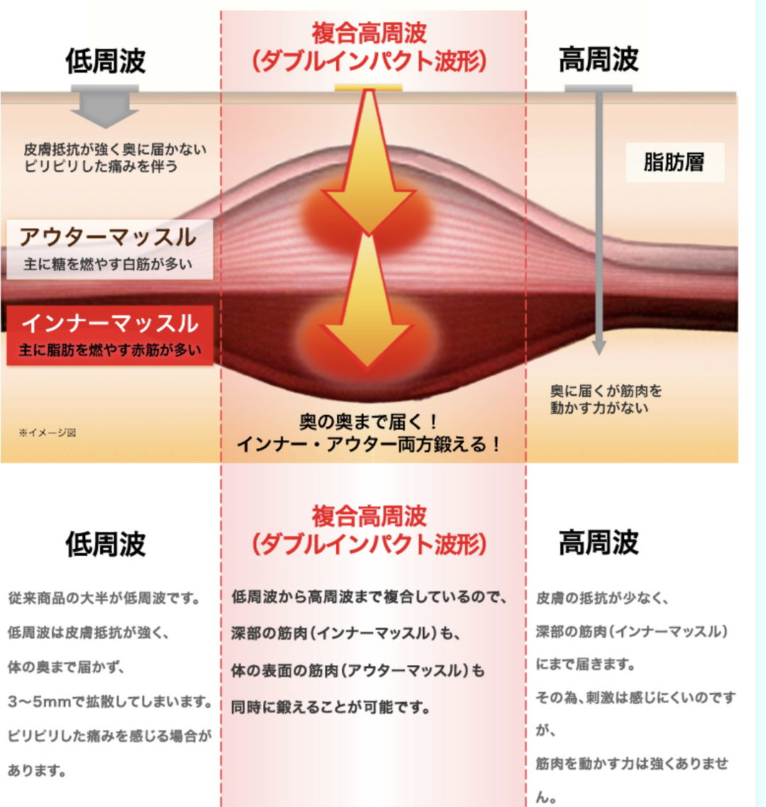 一般的なEMS治療器は、低周波領域(1000㎐以下)のため、体表面から近いアウターマッスルの白筋繊維しか鍛える事が出来ません。見た目だけ身体を引き締めたい方に、適しています。 -