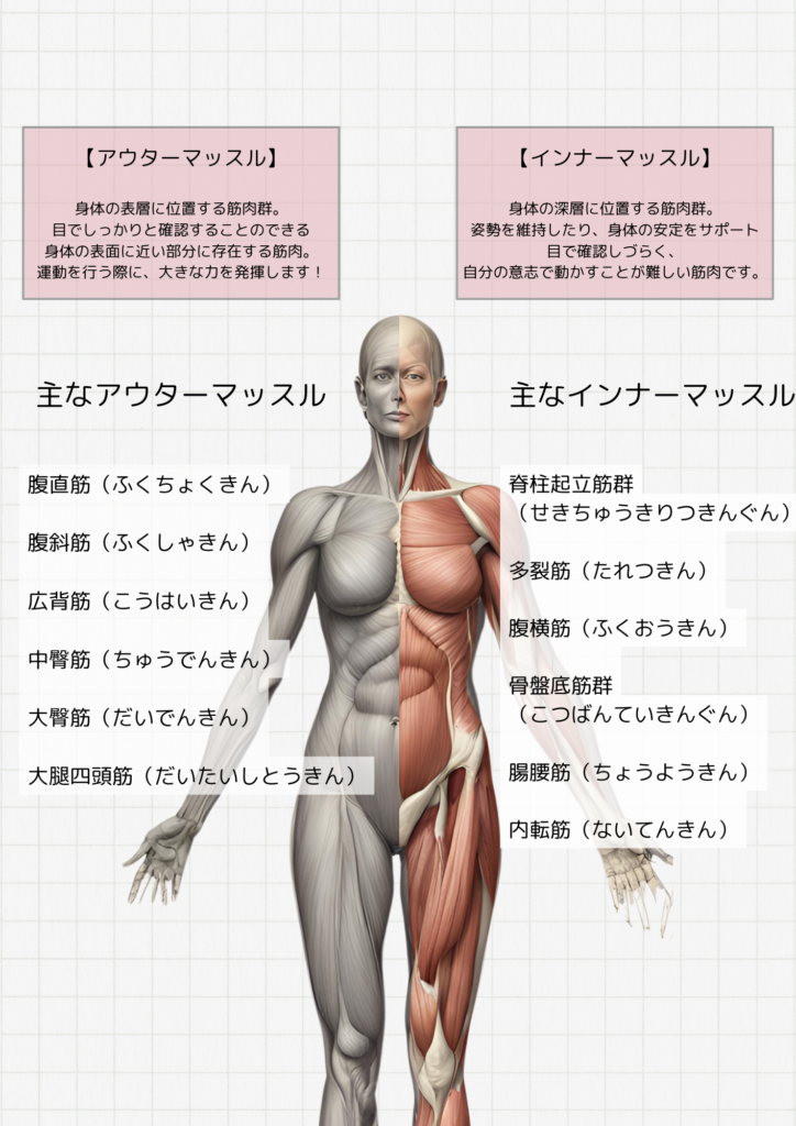 人間の筋肉は大きく分けて「アウターマッスル」「インナーマッスル」の2種類あります。